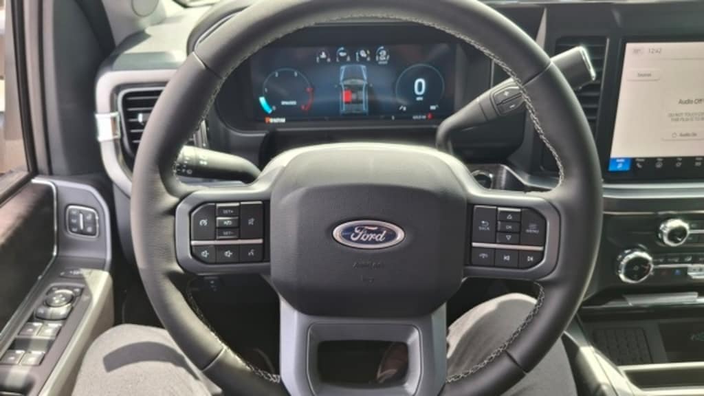 Chrome Package (6" Angular Bright Anodized Step Bars, Chrome Door Handles, Chrome Exhaust Tip, Unique Chrome Mirror Caps, and Wheels: 20" Chrome PVD Aluminum), Order Code 618A, 190 Amp Alternator, 3.73 Axle Ratio, 4-Wheel Disc Brakes, 8 Speakers, ABS brakes, Adjustable pedals, Air Conditioning, Alloy wheels, AM/FM radio: SiriusXM with 360L, Auto High-beam Headlights, Auto-dimming Rear-View mirror, Automatic temperature control, BLIS w/Cross-Traffic Alert, Brake assist, Bumpers: chrome, Compass, Delay-off headlights, Driver door bin, Driver vanity mirror, Dual AGM 68 AH Battery, Dual front impact airbags, Dual front side impact airbags, Electronic Stability Control, Electronic-Locking w/3.31 Axle Ratio, Emergency communication system: SYNC 4 911 Assist, Flow-Through Console, Front ActiveX Seating Material 40/Console/40 Seats, Front anti-roll bar, Front Bucket Seats, Front Center Armrest, Front dual zone A/C, Front fog lights, Front License Plate Bracket, Front reading lights, Fully automatic headlights, Garage door transmitter, Heated door mirrors, Heated front seats, Heated rear seats, Heated steering wheel, Illuminated entry, Low tire pressure warning, Memory seat, Navigation System, Outside temperature display, Overhead airbag, Overhead console, Panic alarm, Passenger door bin, Passenger vanity mirror, Pedal memory, Power door mirrors, Power driver seat, Power passenger seat, Power steering, Power windows, Power-Sliding Rear-Window w/Defrost, Privacy Glass, Radio: B&O Sound System by Bang & Olufsen, Rain sensing wipers, Rear Parking Sensors, Rear reading lights, Rear seat center armrest, Rear step bumper, Rear window defroster, Remote keyless entry, Security system, SiriusXM Radio w/360L, Speed control, Split folding rear seat, Steering wheel mounted audio controls, SYNC 4 w/Enhanced Voice Recognition, Tachometer, Tailgate Step & Handle, Telescoping steering wheel, Tilt steering wheel, Traction control, Trip computer, Turn signal indicator mirrors, Upfitter Switches (6), Variably intermittent wipers, Ventilated front seats, and Wheels: 18" Bright Machined & Carbonized Gray Alum