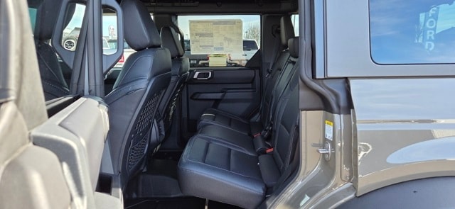 Equipment Group 334A Lux Package (2-Door Intelligent Access with Lock/Unlock, 360-Degree Camera, Adaptive Cruise Control, Ambient Footwell Lighting, Connected Navigation, Driver and Front Passenger Illuminated Sliding Visor Vanity Mirrors, Dual Smart Charging USB Ports, Dual-Zone Electronic Automatic Temperature Control, Evasive Steering Assist, Front Parking Sensors, Front Row Heated Seats, Heated Steering Wheel, Information on Demand Panel, Marine Grade Vinyl Heated Bucket Seats, Pro Power Onboard - 400W, Radio: B&O Sound System by Bang and Olufsen, Rear Parking Sensors, Sideview Mirrors, and Wheels: 17" Carbonized Gray-Painted Aluminum), Ford Connectivity Package (1-Year Included), Sasquatch Package (Front Stabilizer Disconnect, High Clearance Suspension, Position-Sensitive Bilstein Shock Absorbers, and Wheels: 17" Matte Black Alloy), 4-Wheel Disc Brakes, 7 Speakers, ABS brakes, Air Conditioning, Alloy wheels, AM/FM radio: SiriusXM with 360L, AM/FM Stereo, Auto High-Beam Headlamps, Auto High-beam Headlights, Auto-dimming Rear-View mirror, BLIS Blind Spot Information System, Brake assist, Carbonized Gray Molded-in-Color Hard Top, Compass, Delay-off headlights, Driver door bin, Driver vanity mirror, Dual front impact airbags, Dual front side impact airbags, Electronic Stability Control, Emergency communication system: 911 Assist, Exterior Parking Camera Rear, Front anti-roll bar, Front Bucket Seats, Front Center Armrest, Front fog lights, Front License Plate Bracket, Front reading lights, Front wheel independent suspension, Fully automatic headlights, Hard Top Sound Deadening Headliner, Heated door mirrors, Heated front seats, Illuminated entry, Integrated roll-over protection, Lane-Keeping System, Leather Shift Knob, Low tire pressure warning, Occupant sensing airbag, Outside temperature display, Overhead airbag, Overhead console, Panic alarm, Passenger door bin, Passenger vanity mirror, Power door mirrors, Power steering, Power windows, Pre-Collision Assist with Automatic Emergency Braking, Radio data system, Rear-View Camera, Rear-Window Defroster and Washer, Remote keyless entry, Security system, SiriusXM with 360L, Speed control, Split folding rear seat, Steering wheel mounted audio controls, SYNC 4, Tachometer, Telescoping steering wheel, Tilt steering wheel, Traction control, Trip computer, Variably intermittent wipers, and Voltmeter